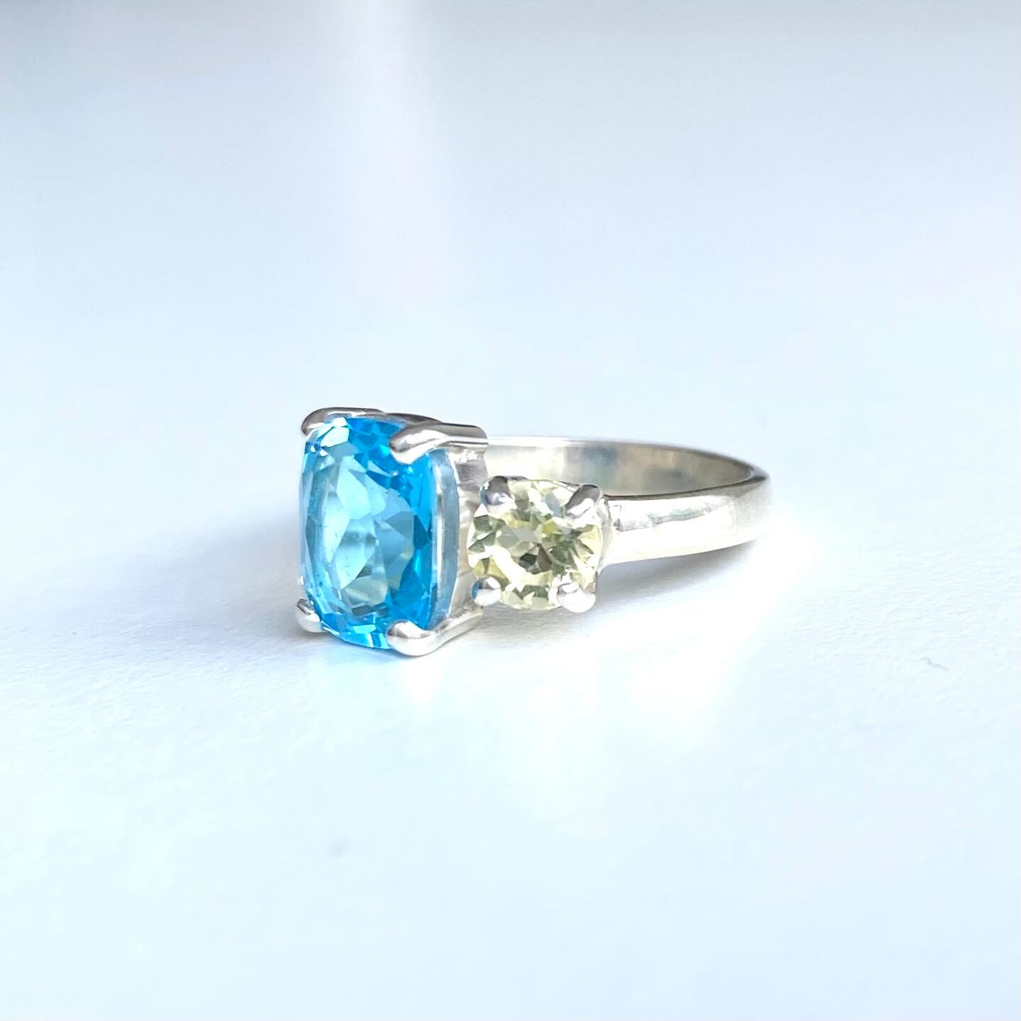 ブルーとイエローの爽やかな色合いとファセットカットの煌めきが魅力のリングです。