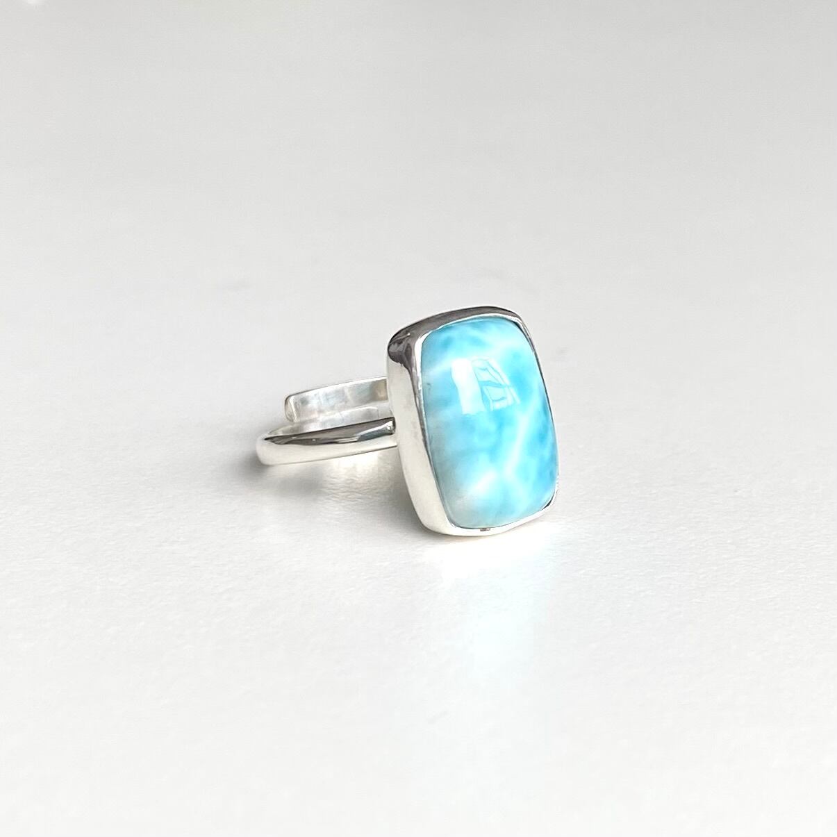 美しい模様に心癒される四角いラリマーのサイズ調整していただけるタイプのリングです。グレードの高いラリマーを使用しています。