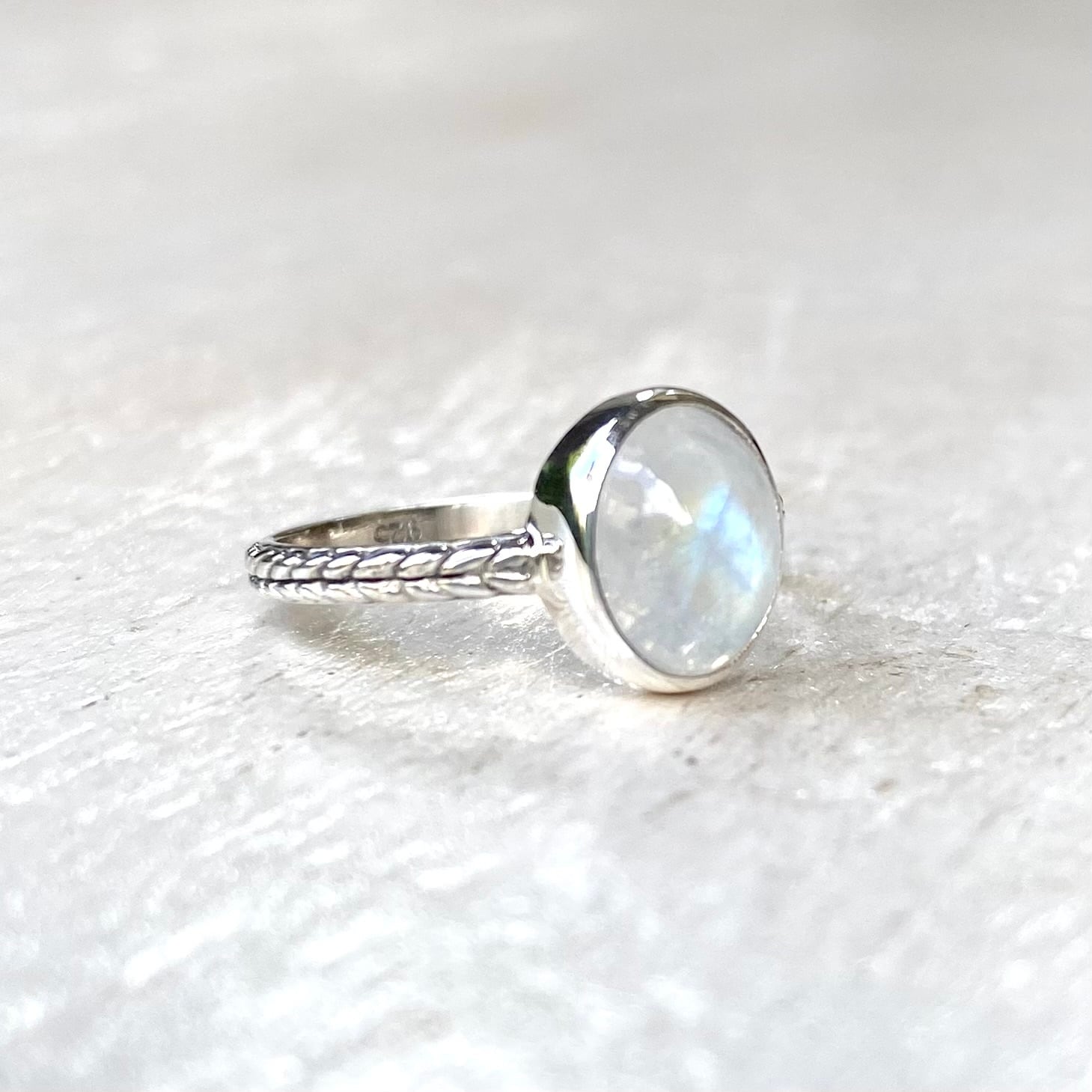 シルバー925製、アームに月桂樹模様が入った落ち着いた印象のレインボームーンストーンのリングです。