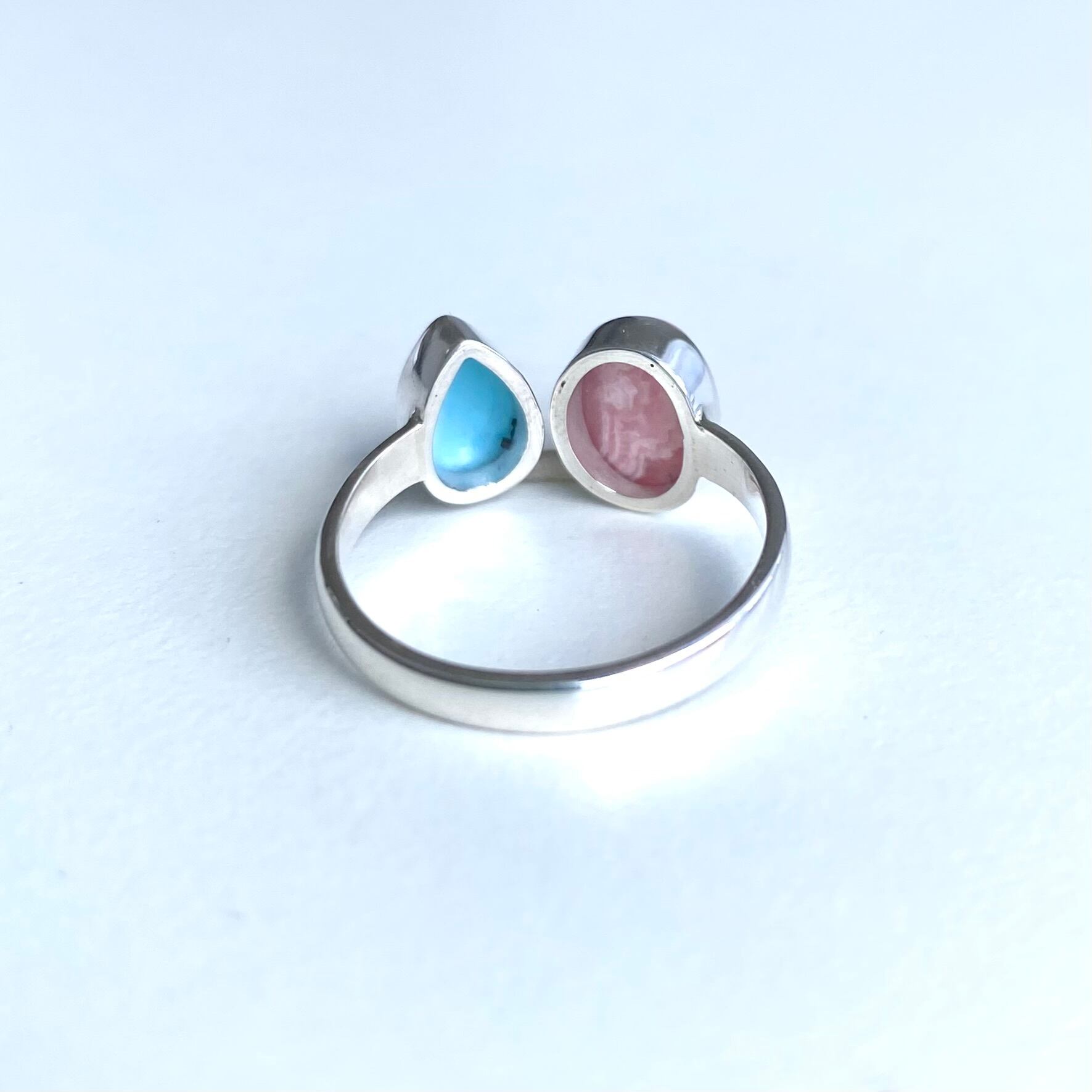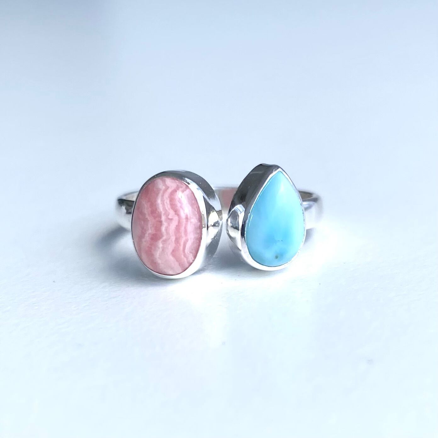 水色のラリマーとローズピンクのインカローズを組み合わせたフォークリングです。