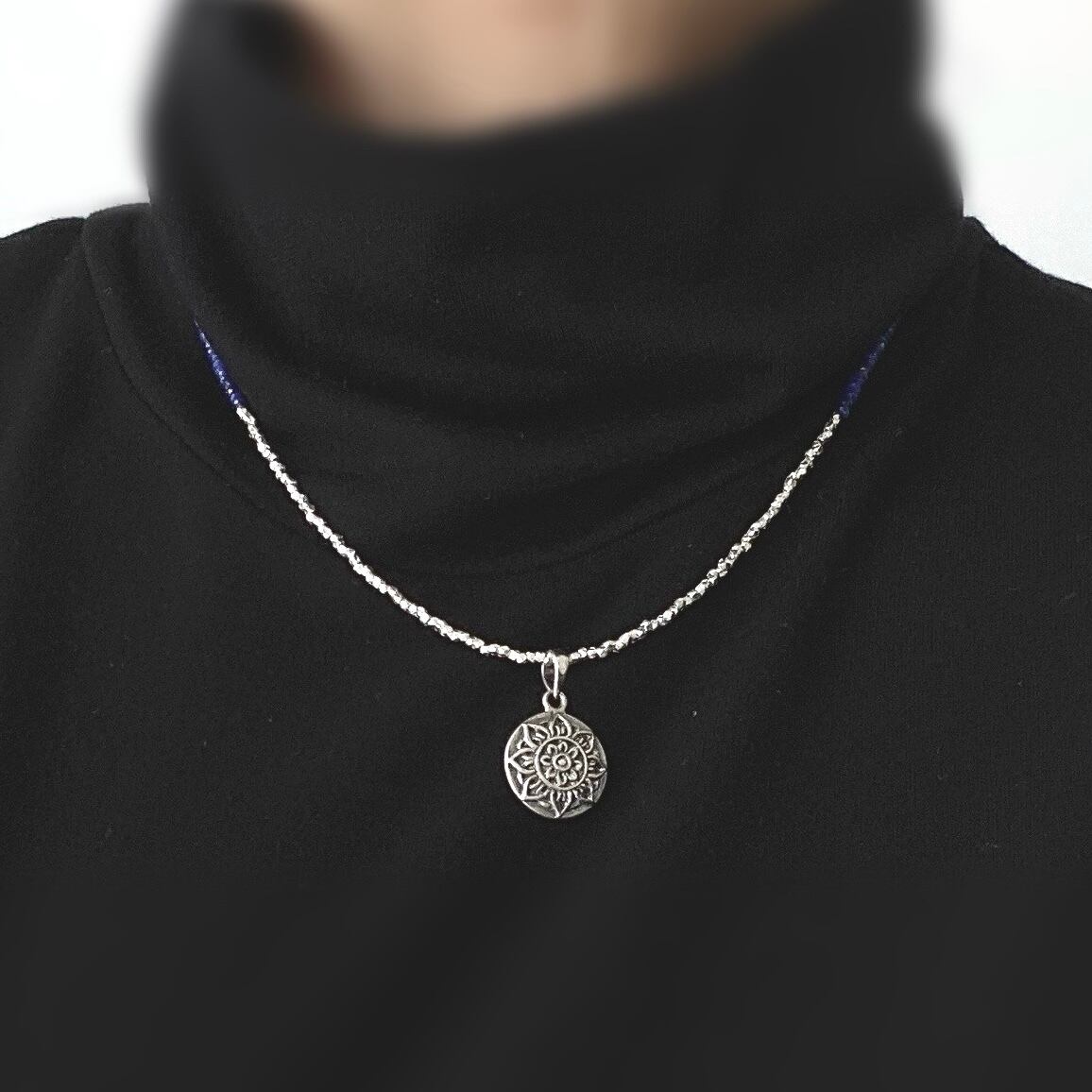 曼荼羅を記したペンダントチャームのラピスラズリとカレンシルバービーズのネックレスです。