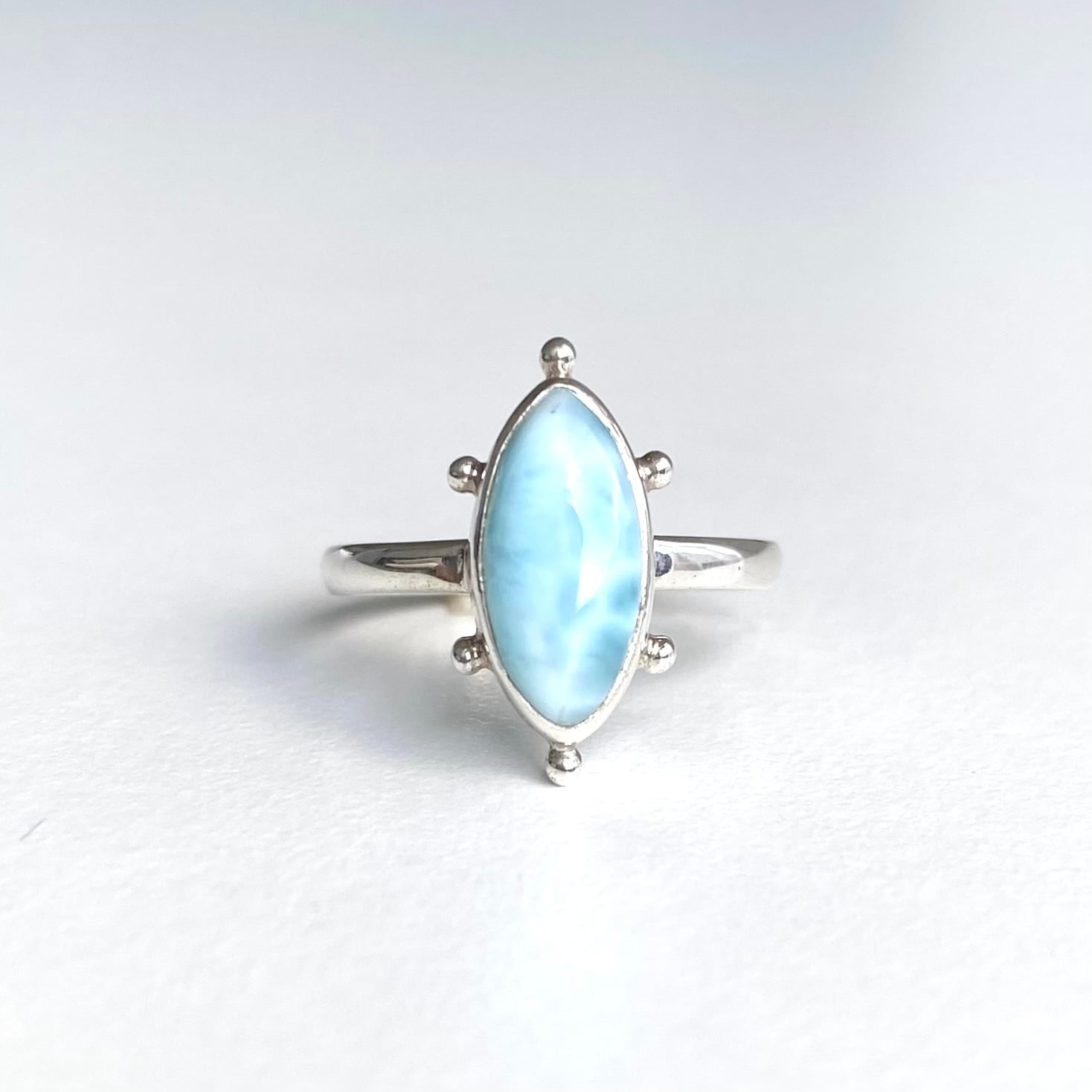 繊細な模様に心癒されるマーキス型ラリマーの14号リングです。淡いブルーのグラデーションが広がる癒しのラリマーに水滴のようなシルバーボールの装飾が映えるリングです。