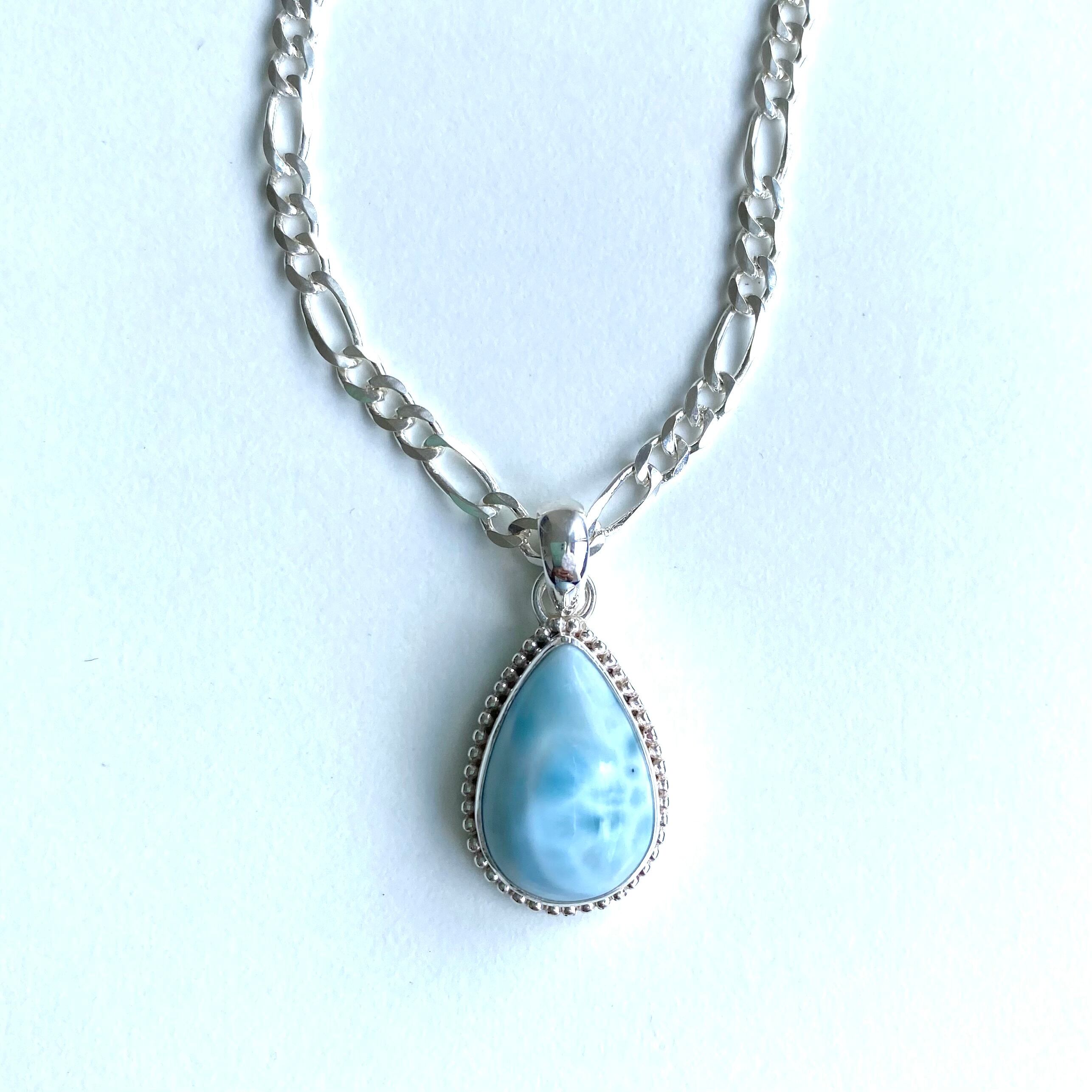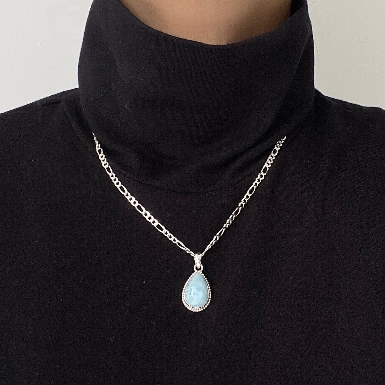 ふっくらとしたボリューム感のあるペアシェイプ型ラリマーのネックレスです。柔らかな癒しのラリマーグラデーションが楽しめます。滑らかでよく輝くフィガロチェーンと共に胸元を明るく柔らかに演出します。