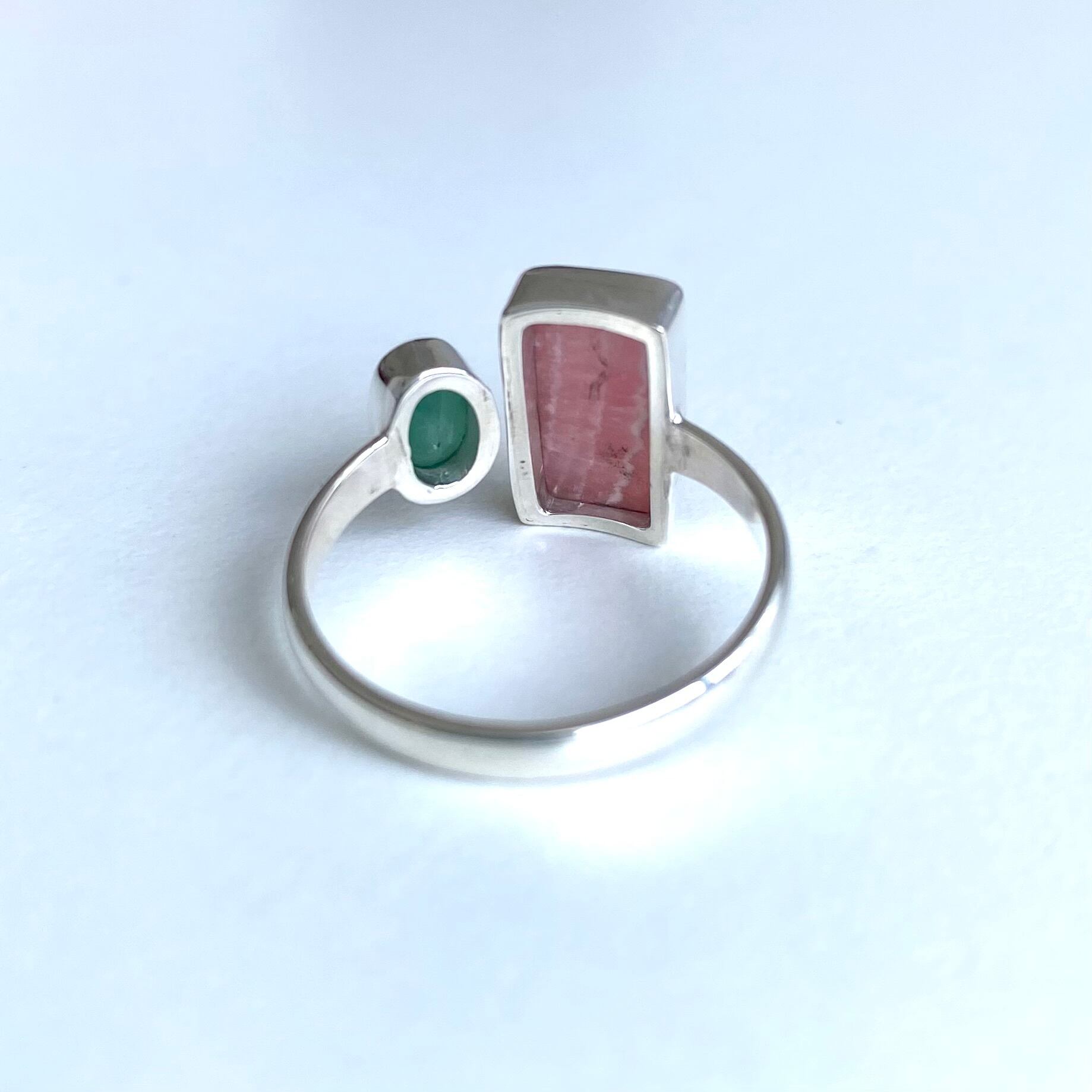 薔薇色の縞模様が印象的なインカローズをエメラルドと組み合わせたフォークリングです。