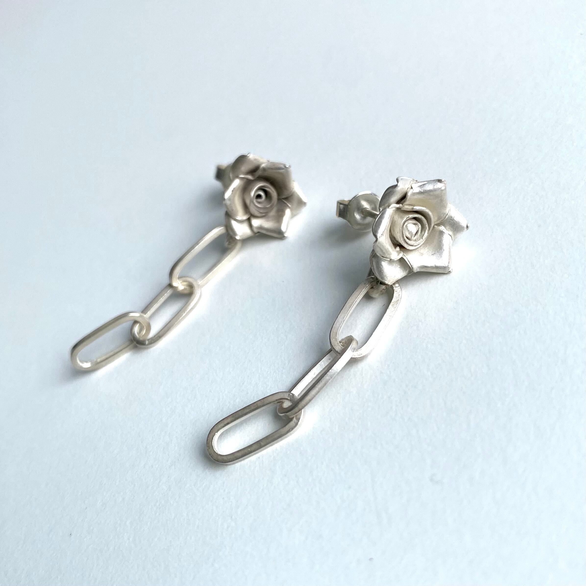 シルバー925製、繊細に形作られた薔薇チャームにチェーンを添えたスタッドピアスです。 艶消し気味の仕上げとなっております。 全長4.5センチ。 海外からの発送となります。