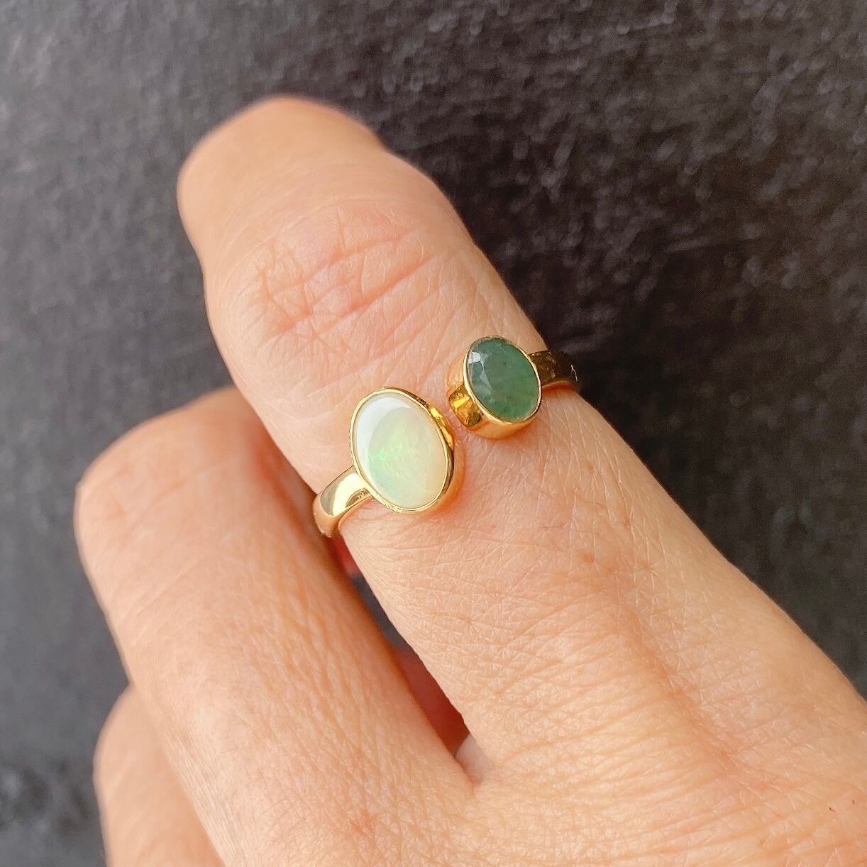 なめらかな白地にグリーン系の遊色がきらめくソリッドオパールとコクのあるグリーンのエメラルドのフォークリングです。品格あるゴールドカラーで仕上げました。