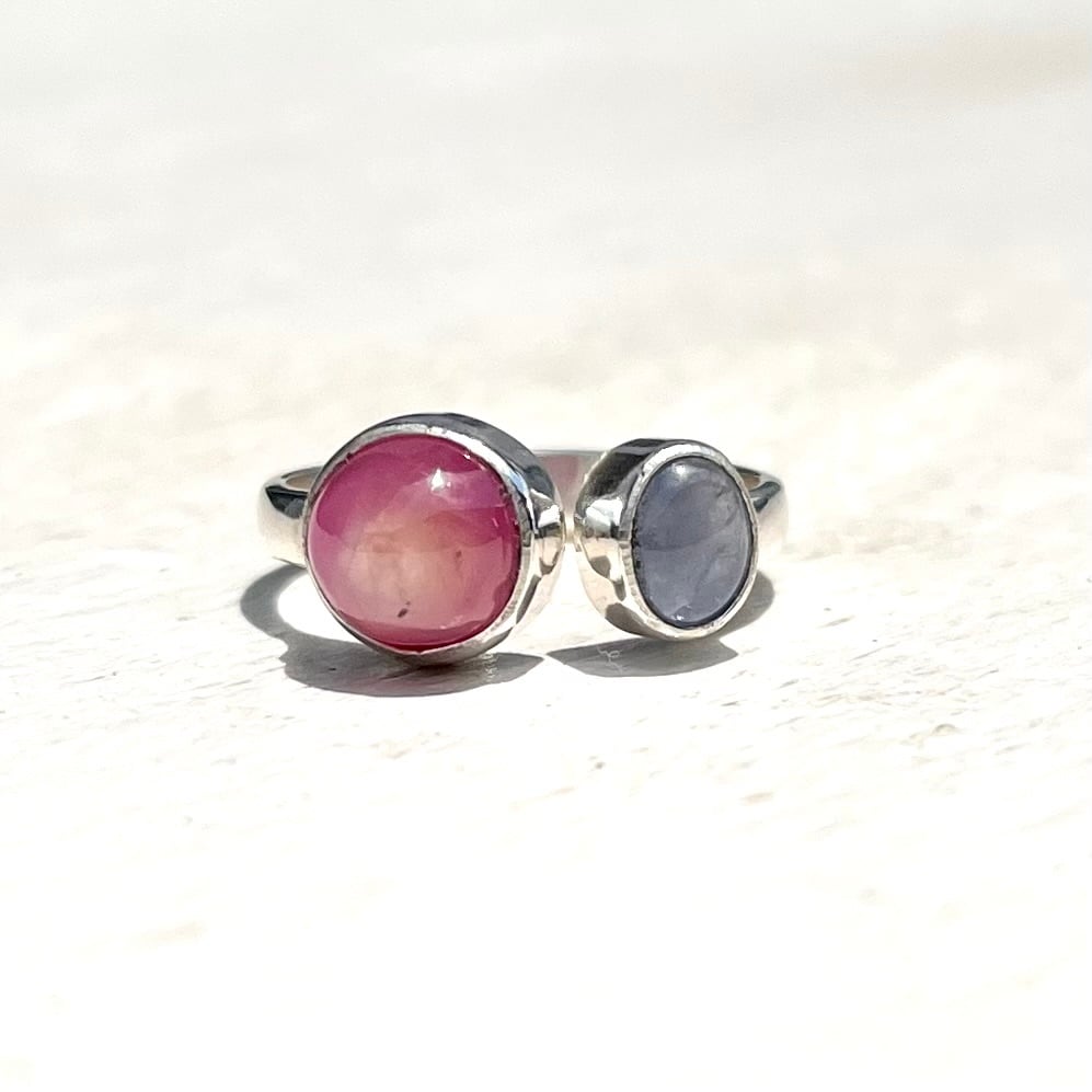 品格ある柔らかなカラーのルビーとサファイアのフォークリングです。