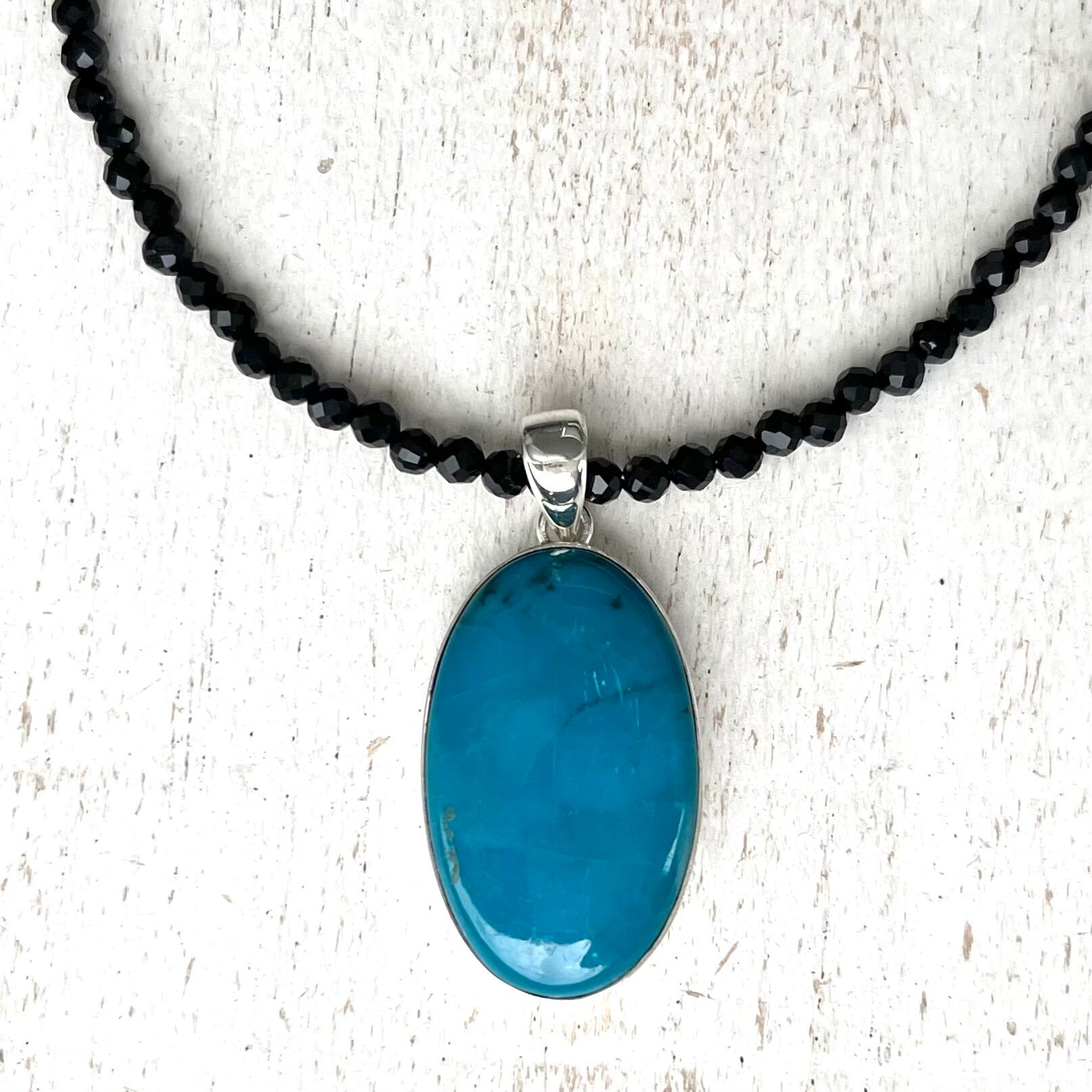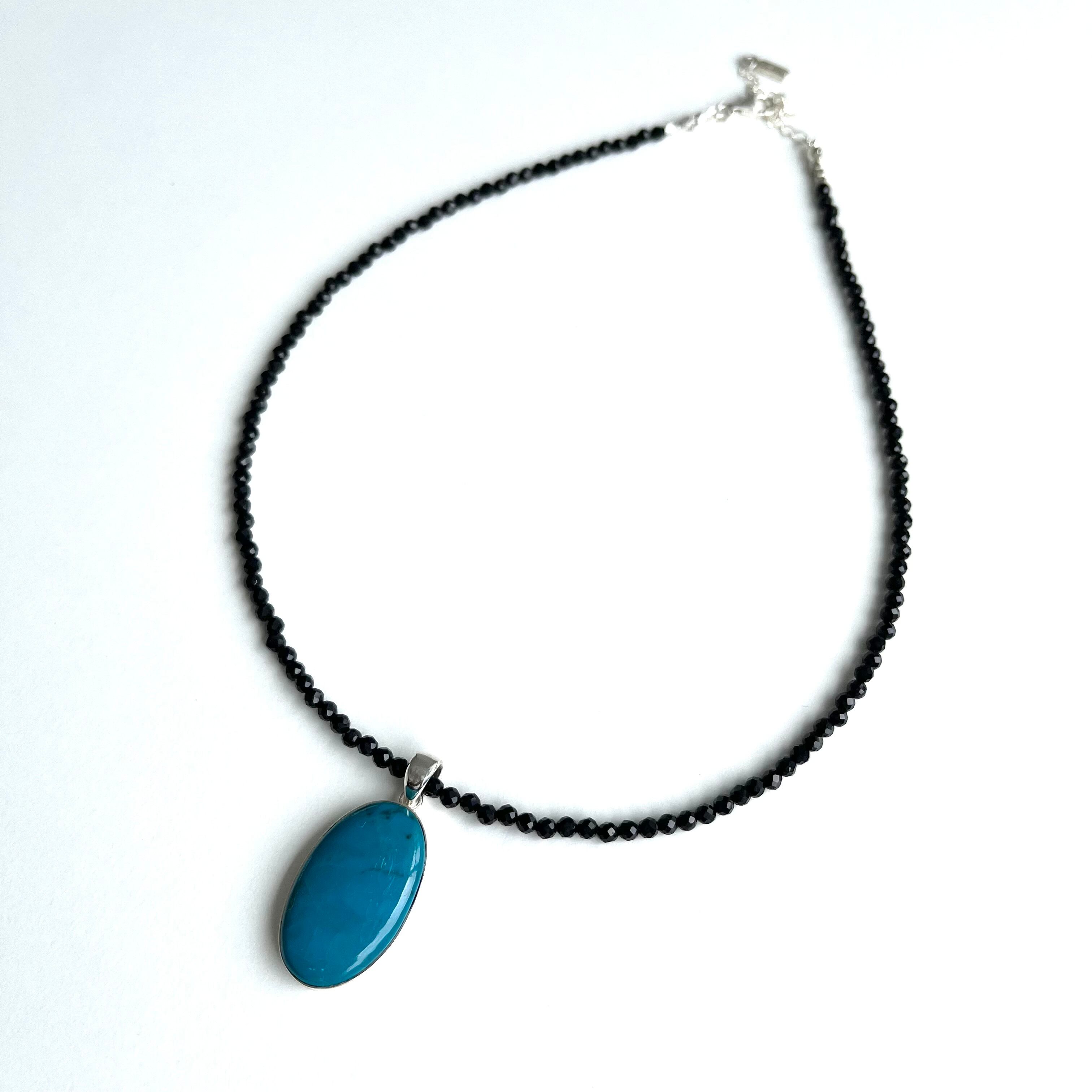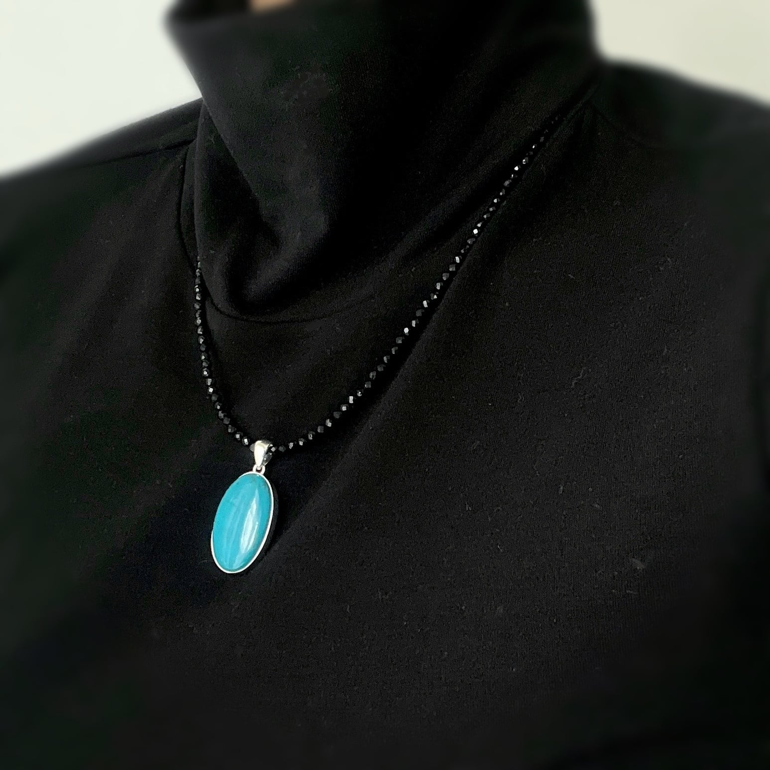 シンプルなオーバルカットの大ぶりなクリソコラの深い青緑が印象的なビーズネックレスです。