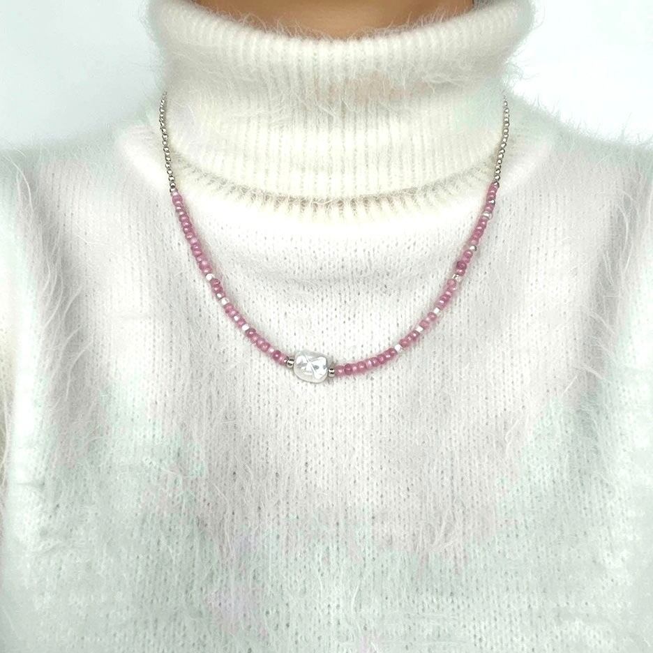 小さなシルバービーズはカレンシルバー。ぷっくりとした豆のようなシルバーチャームとチェーンネックレスはシルバー925製です。