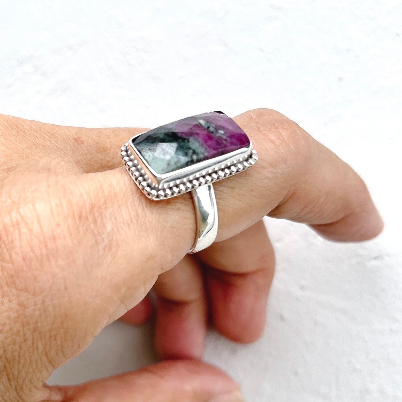 野生的でありながら繊細な女性性を併せて持ち合わせたような印象のルビーインゾイサイトのリングです。