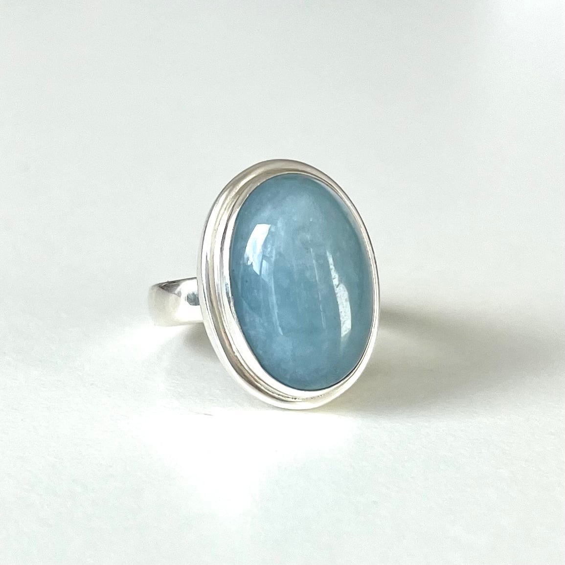 シンプルなシルバー加工がアクアマリンを印象的に引き立てます。大ぶりで存在感あるリングです。