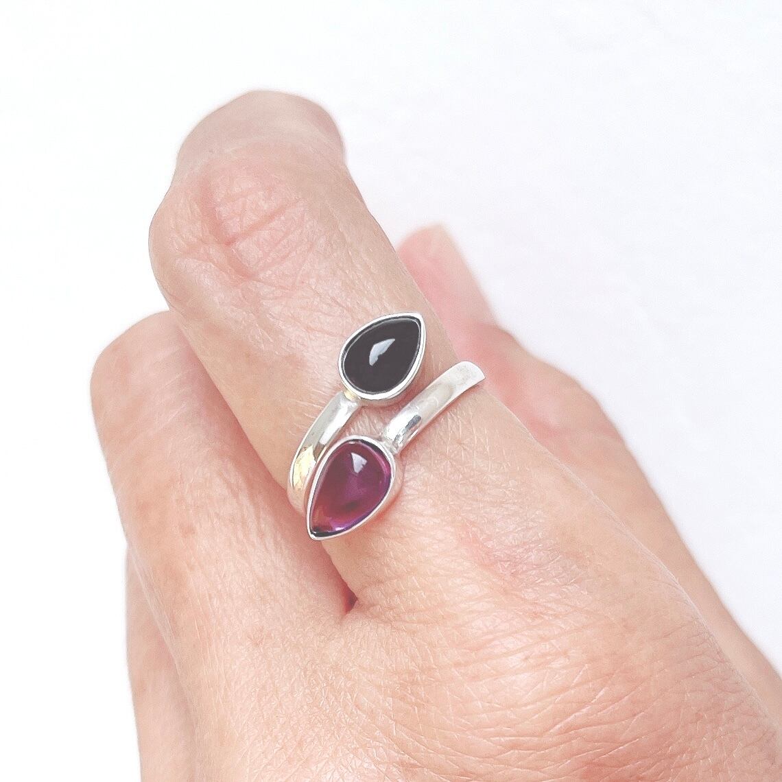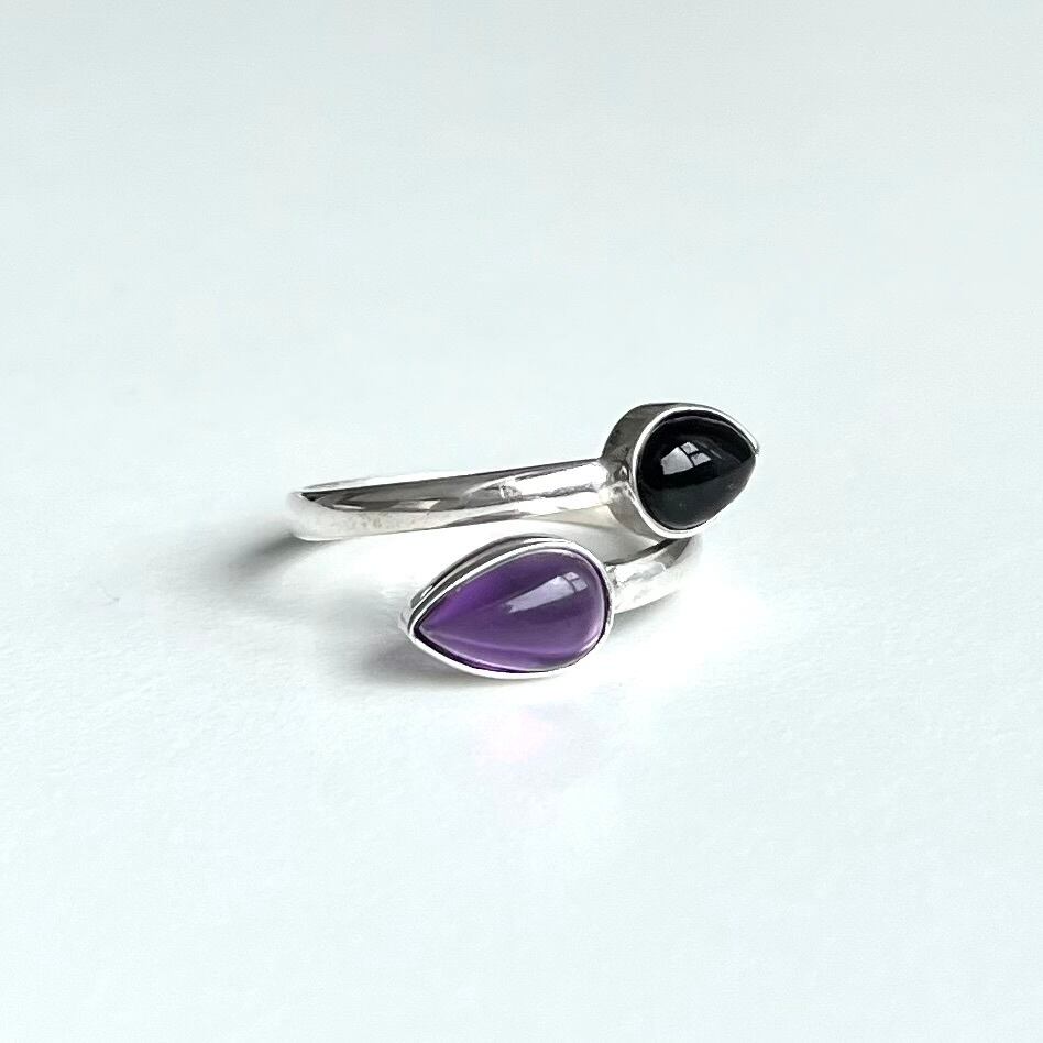 黒オニキスとアメジストの高貴でミステリアスな色合わせが魅力のスパイラルリング。ネガティブなものから身を守りたい方にお勧めの組み合わせです。