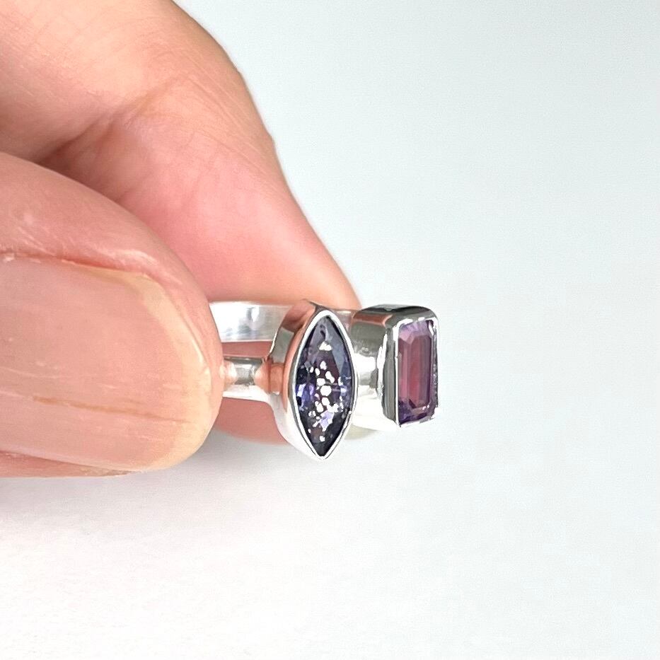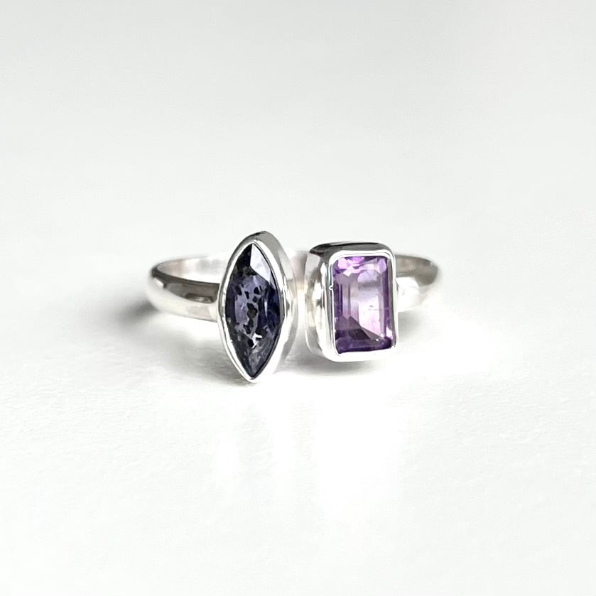 深い青と紫の組み合わせが品格あるアイオライトとアメシストのフォークリングです。アイオライトには細かな含有物がありキラキラと煌めきます。