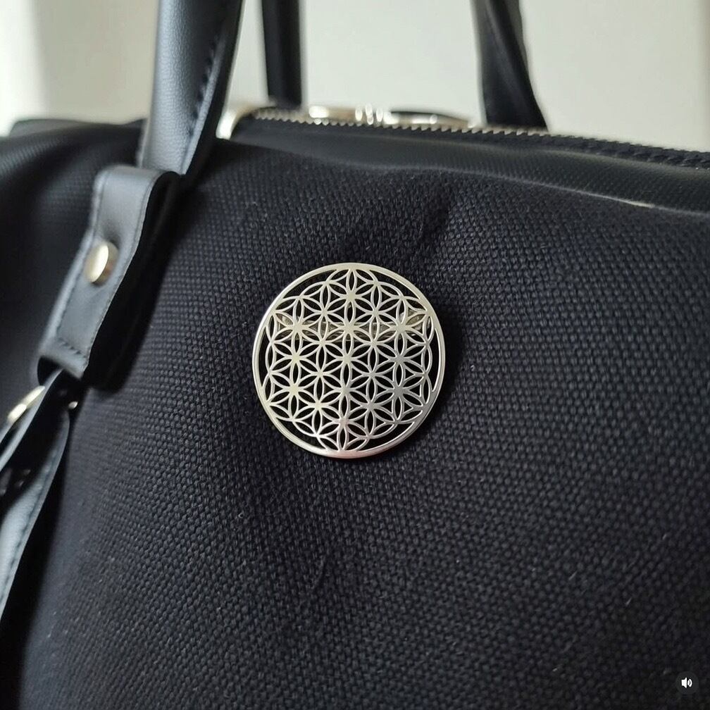 直径3センチの大きさのフラワーオブライフのブローチ。留め具の部分まで全てシルバー925で作られたUbud Moon オリジナルのブローチです。簡単なお手入れでいつまでも長く美しい銀の輝きを楽しんでいただけます。