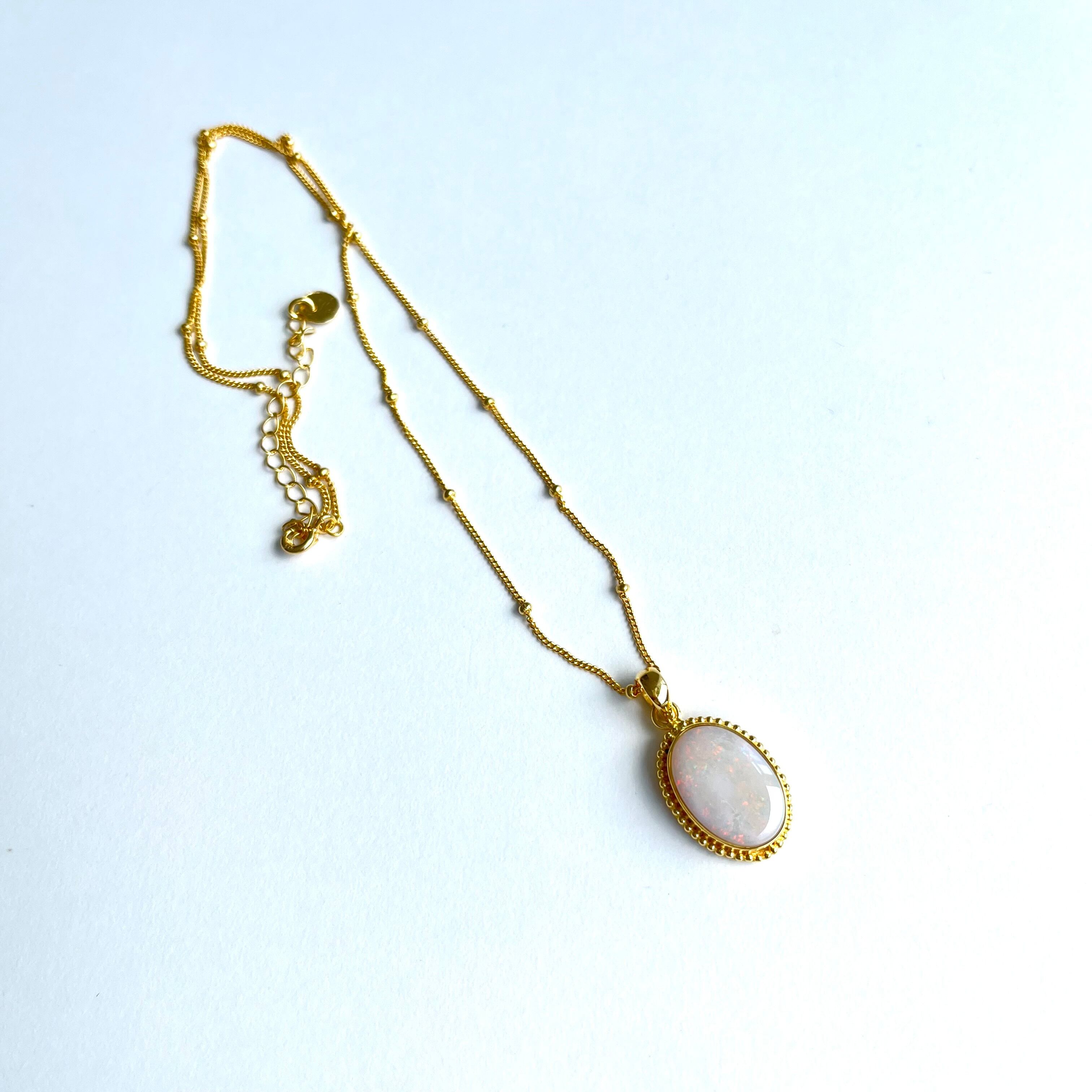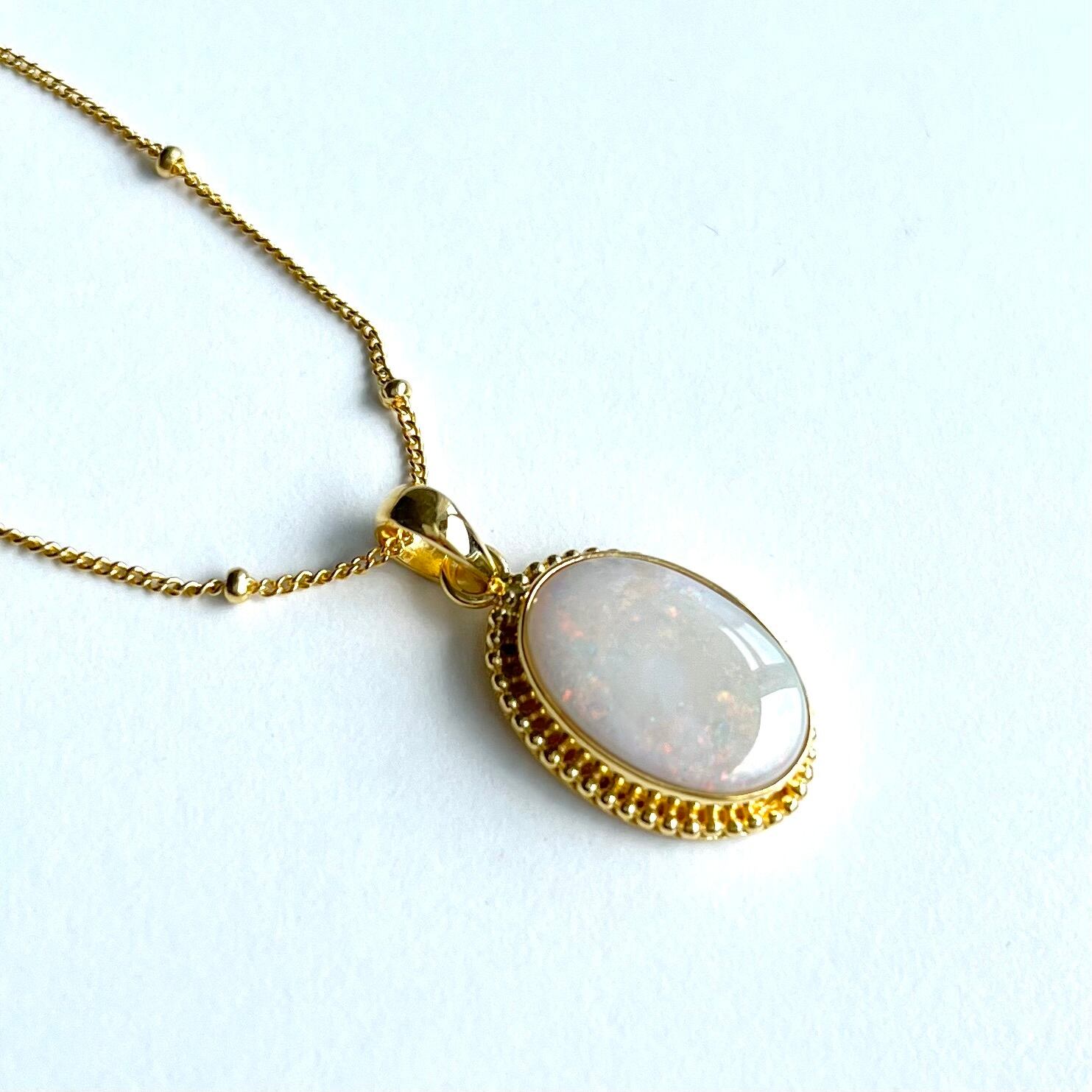 柔らかな白をベースに多彩な遊色が輝くホワイトソリッドオパールのゴールドプレートネックレスです。