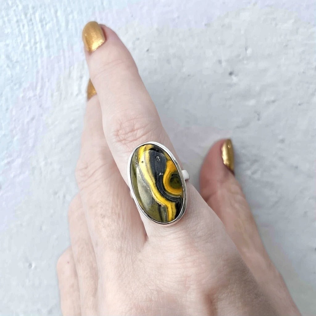 個性的でエネルギー溢れる色と模様のインドネシア原産バンブルビーのサイズ調整していただけるリングです。