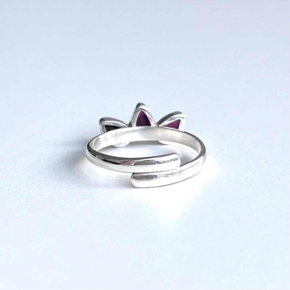 ファセットカットがきらめく小粒なルビーをロータスの花のかたちに並べたシンプルなリングです。リング部分はサイズ調整していただけます。