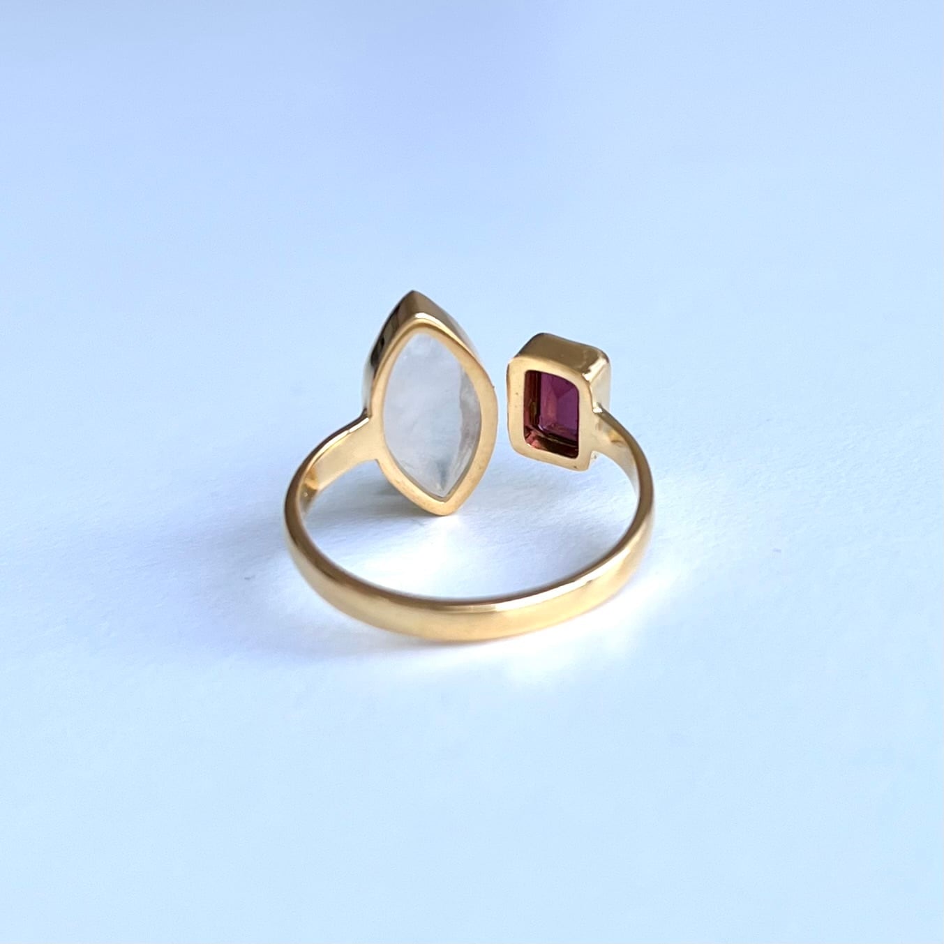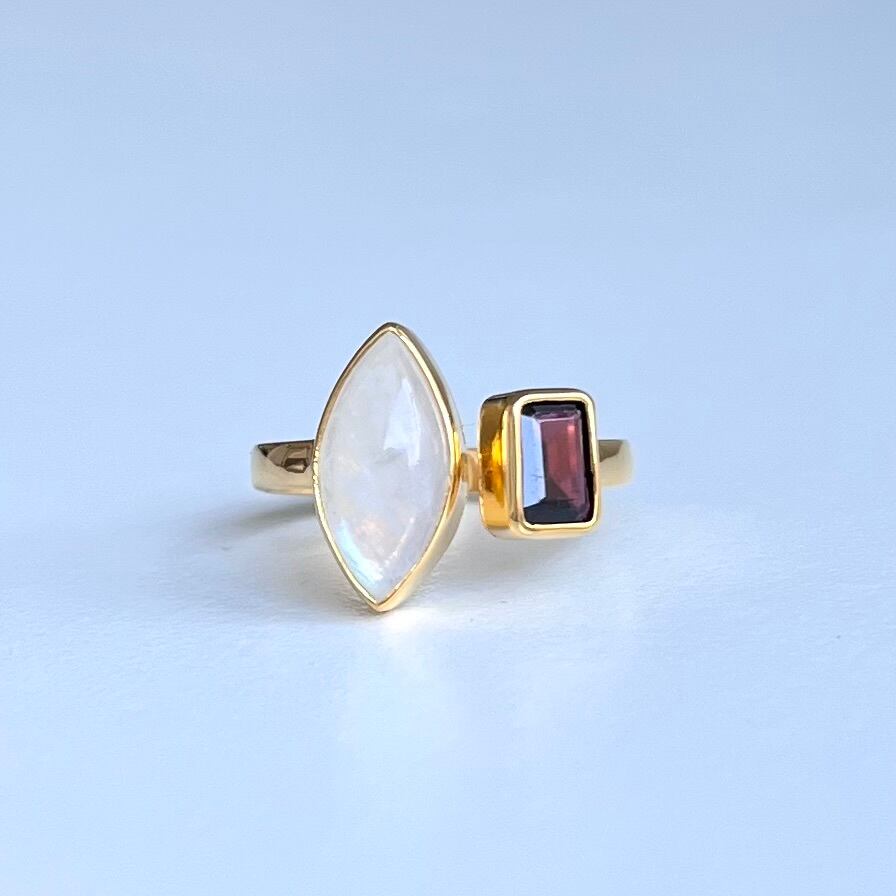 オーロラのような美しいシラーが浮かぶレインボームーンストーンと四角いガーネットのフォークリングです。