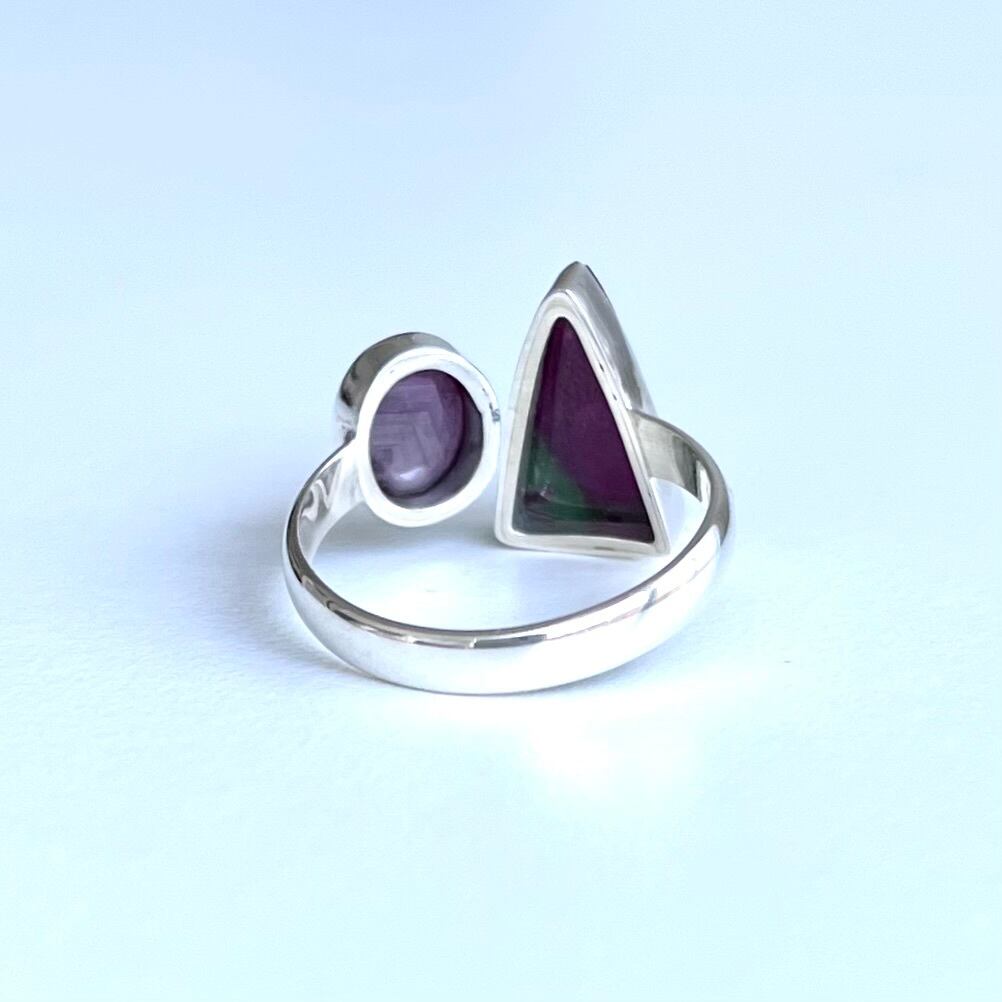 ツンと尖った三角形のルビーインゾイサイトとこっくりとした赤紫色のスタールビーを組み合わせたフォークリングです。