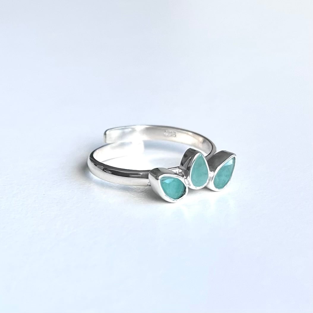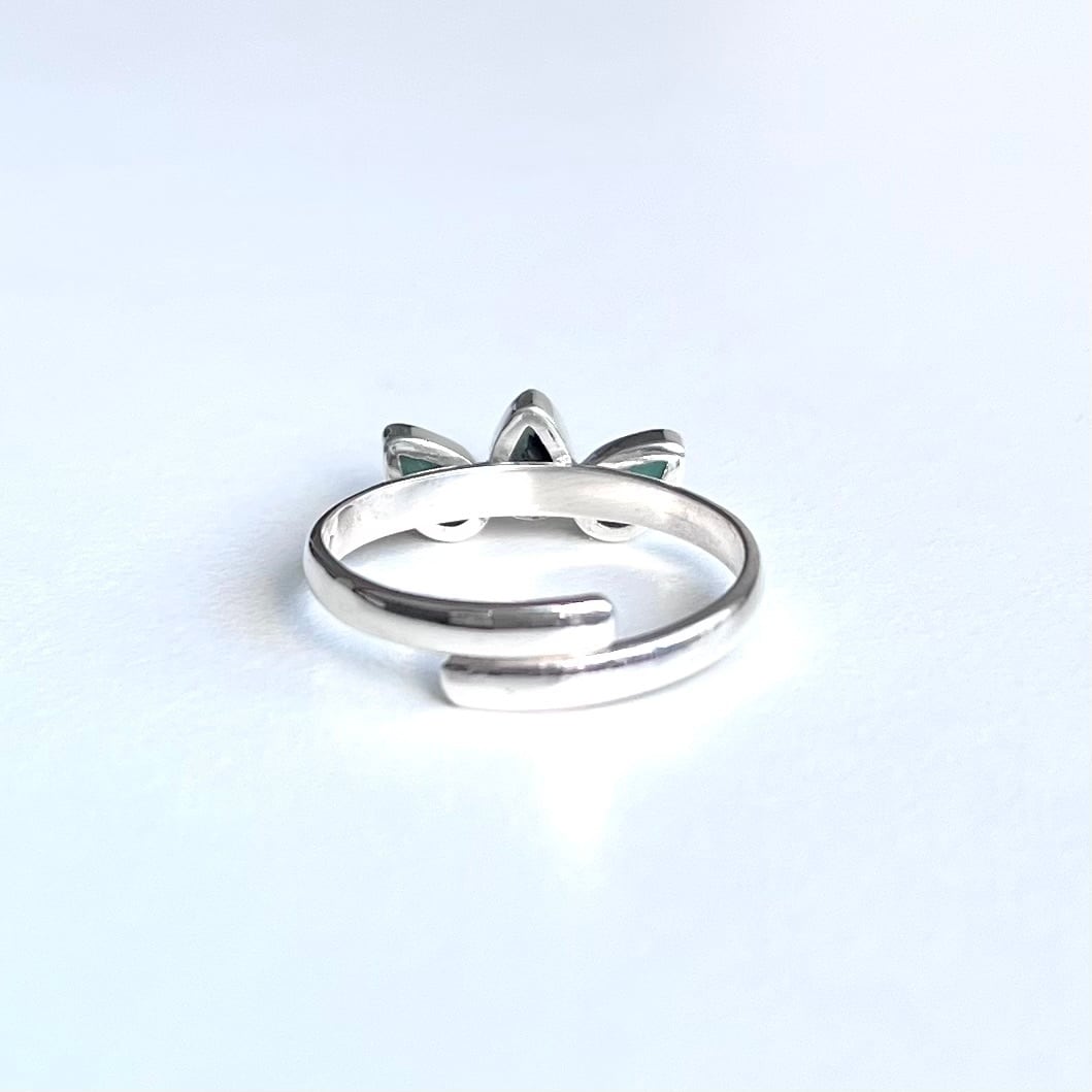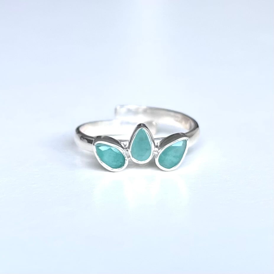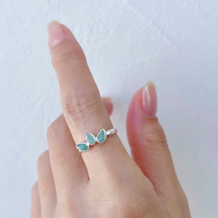 ファセットカットの小粒なエメラルドをロータスの花のかたちに並べたシンプルなリングです。リング部分はサイズ調整していただけます。