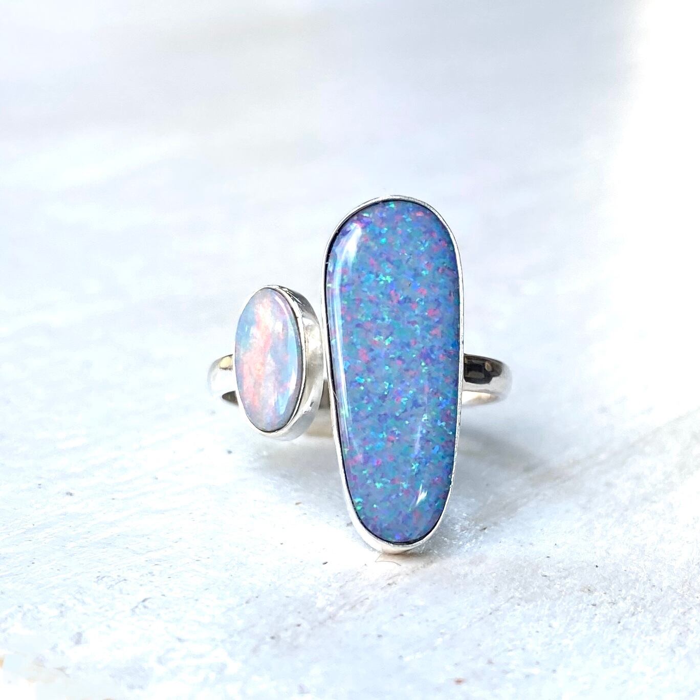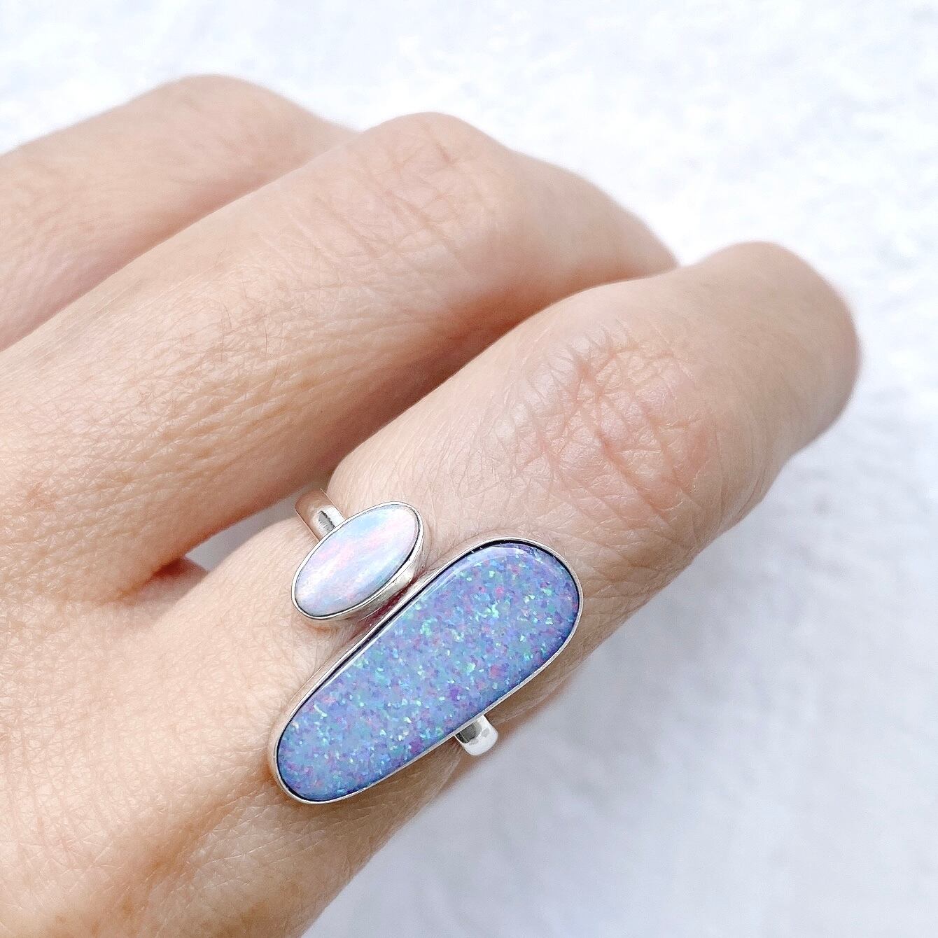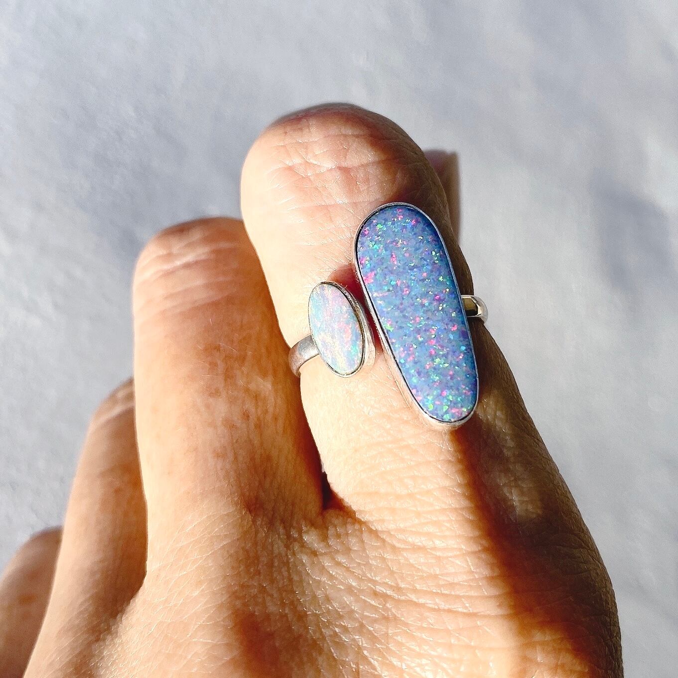 2粒の明るい輝きのダブレットオパールのフォークリングです。ひとつはとても大ぶりですっきりとした縦長のラインが指を美しく見せてくれると思います。オパール同士の色味の違い、丸みのある形とキラキラとした明るい遊色も魅力です。