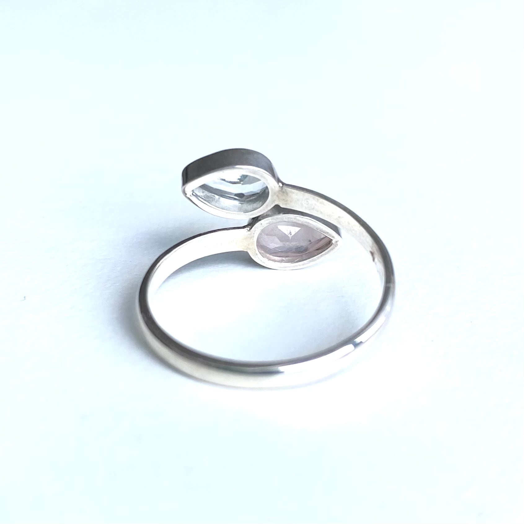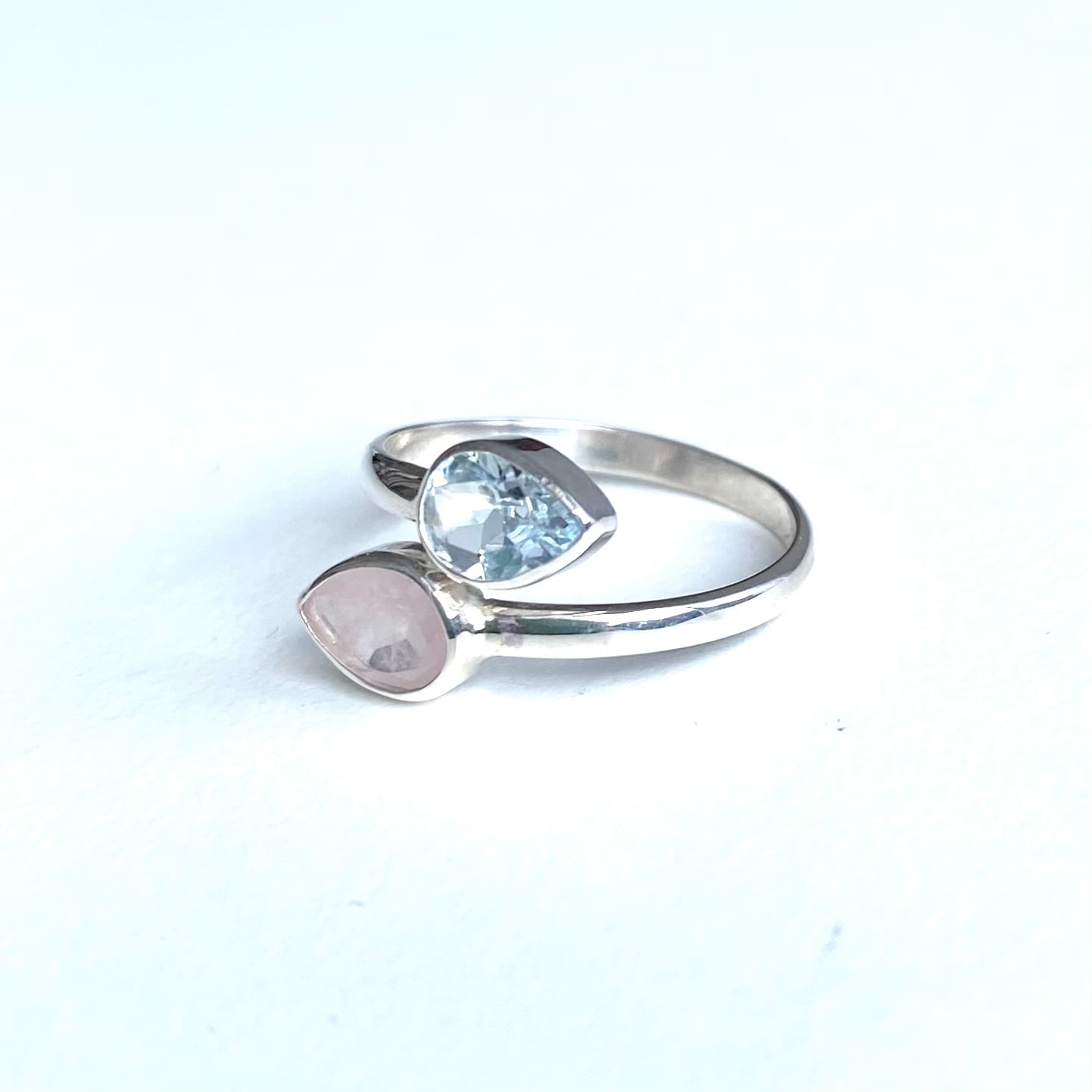 ピンクと水色の色合わせが瑞々しいローズクォーツとアクアマリンのリングです。