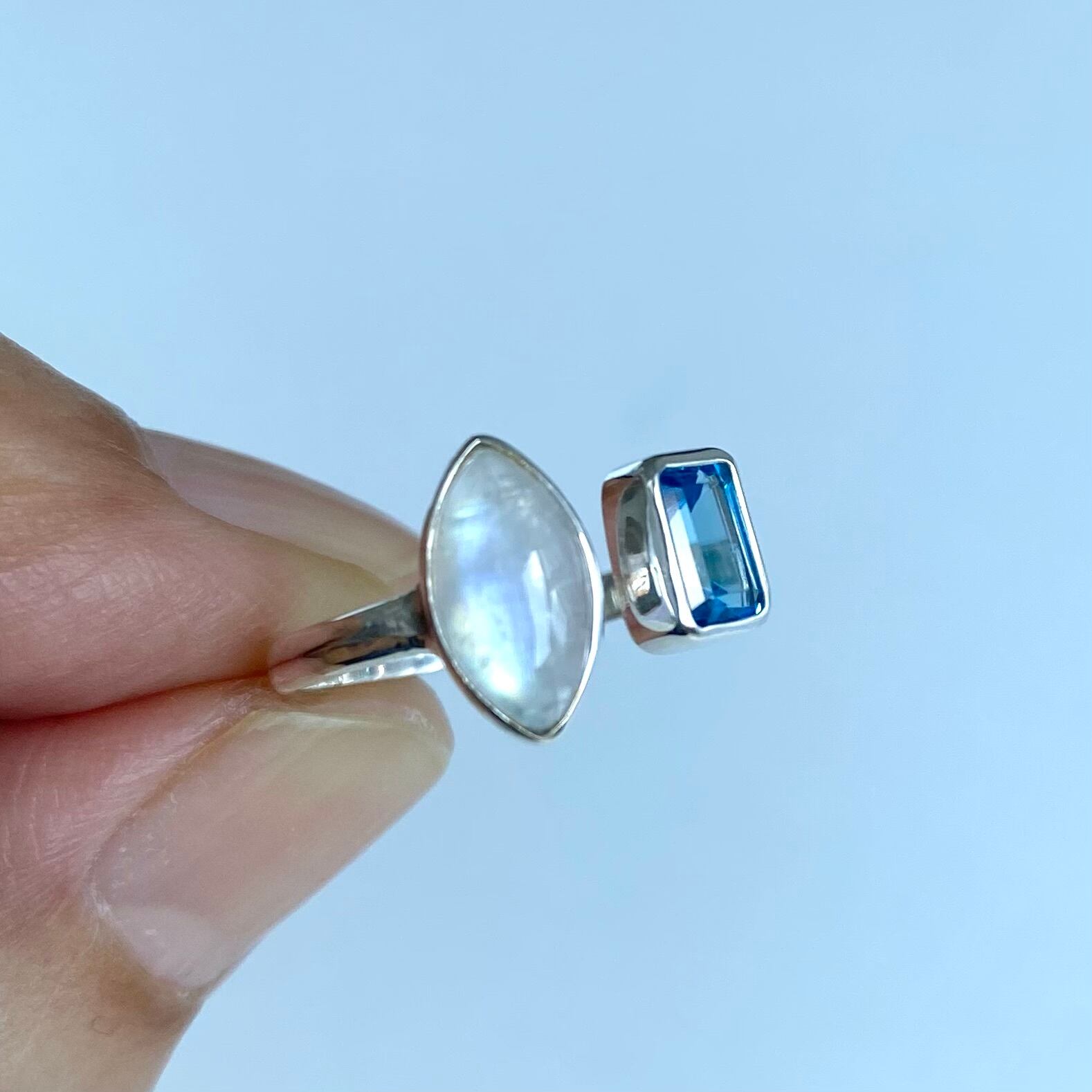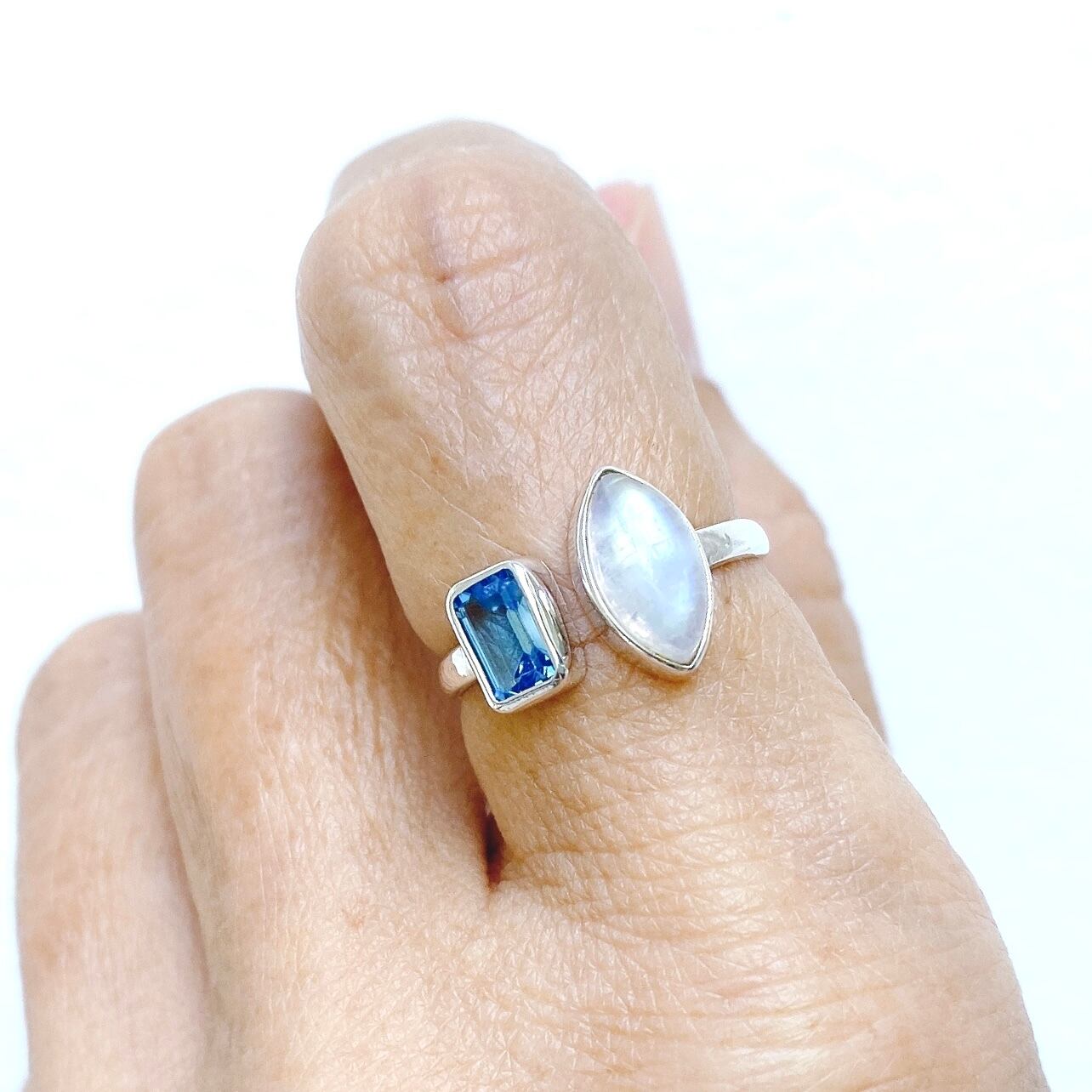レインボームーンストーンとブルートパーズのフォークリング SV925
