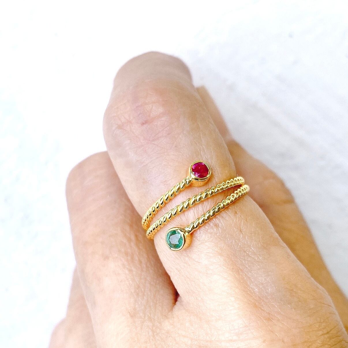 スパイラルに指に巻きつくリングの先に小粒なエメラルドとルビーを配置したリングです。赤と緑の明るい色の組み合わせとファセットカットの煌めきが魅力です。