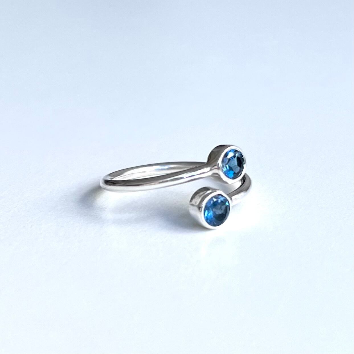 深い青が印象的な2粒のロンドンブルートパーズを配置したサイズ調整していただけるリングです。