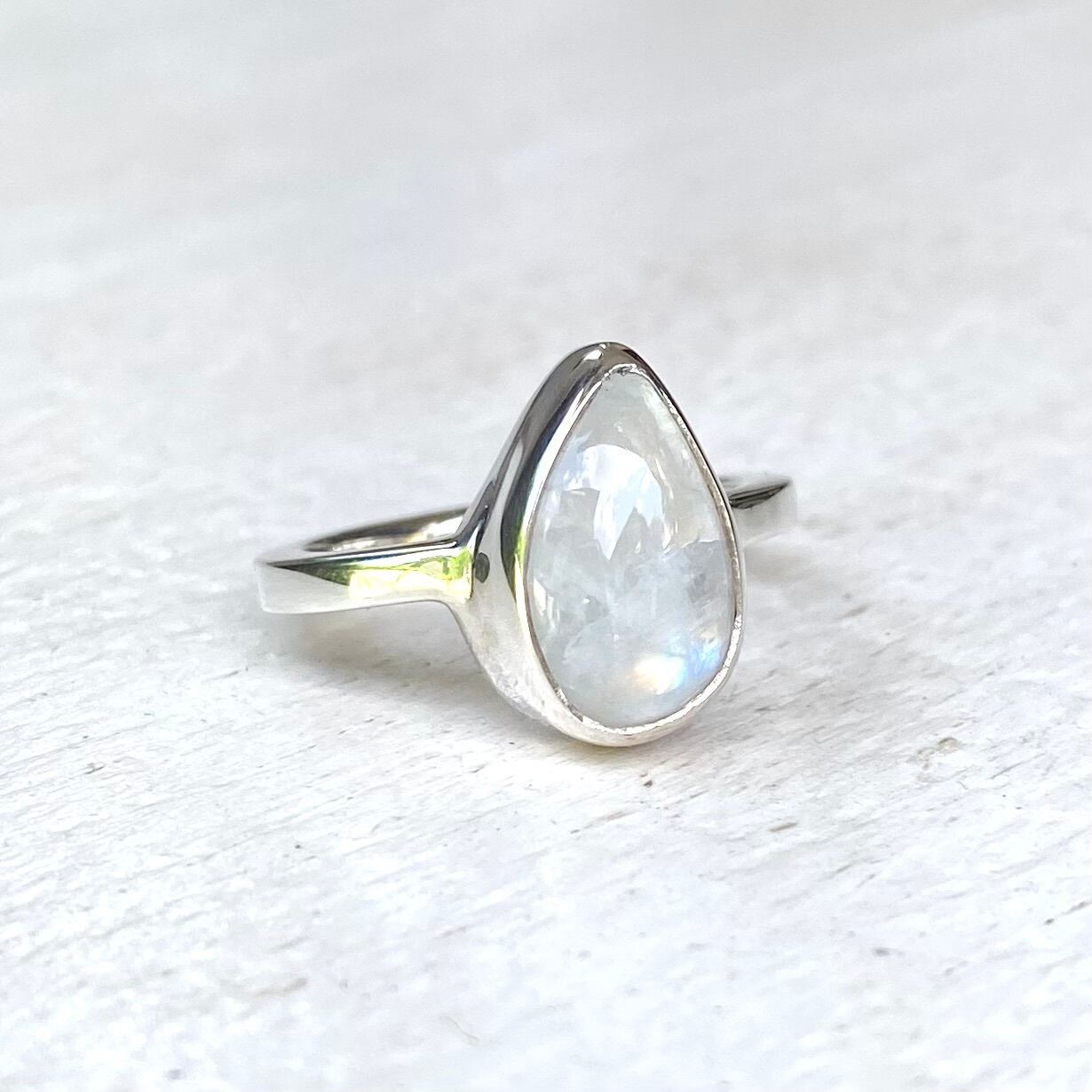 ふわりとした趣きのあるレインボームーンストーンのシンプルなリングです。やや大ぶりなしずく型で優しい存在感があります。表面に美しい虹のようなシラーが現れます。