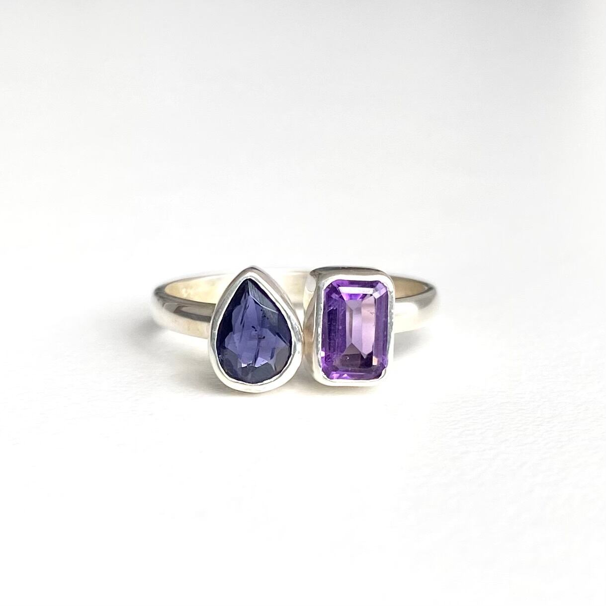 深い青と紫の組み合わせが品格あるアイオライトとアメシストのフォークリングです。
